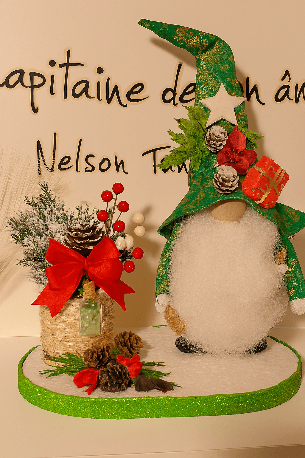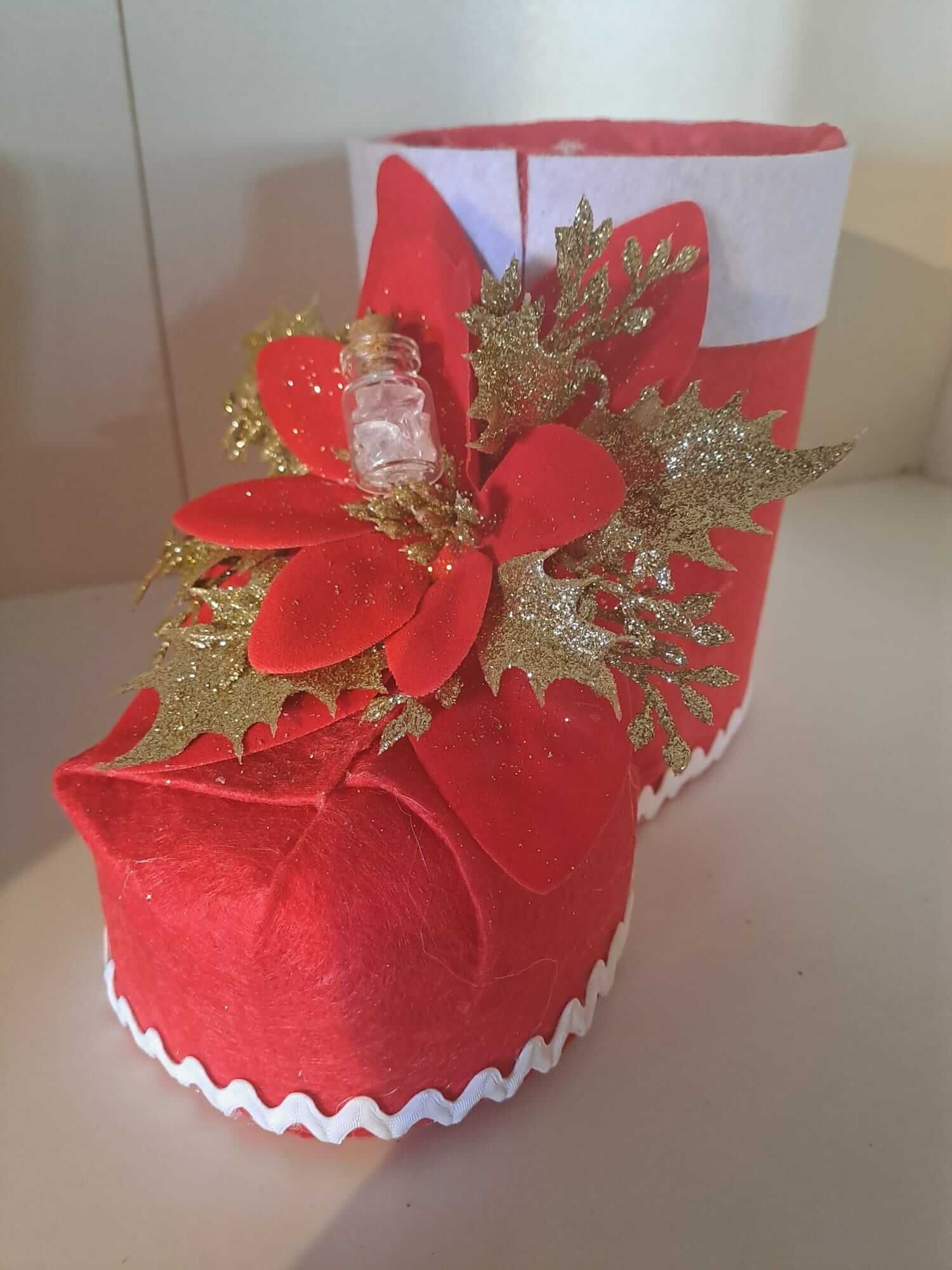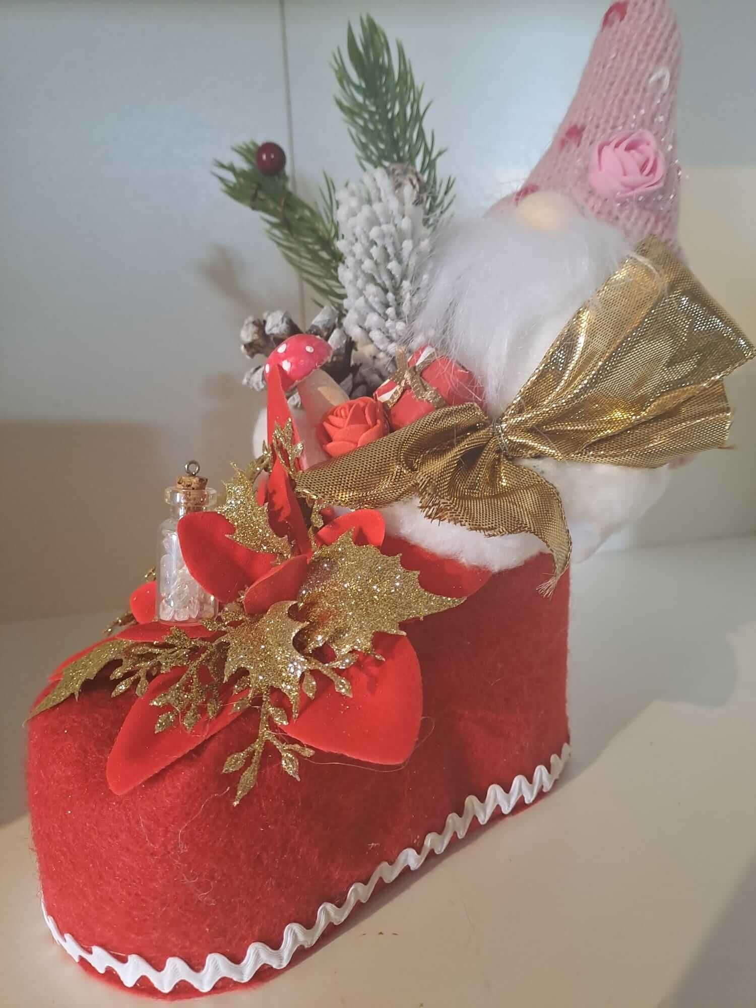 Dans cette botte rouge, cousue de lumière, un gnome veille, porteur de joie et de mystère. Autour de lui, feuillage, baies, étoiles et neige, comme un petit monde végétal en fête.